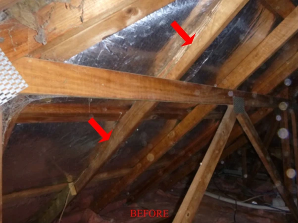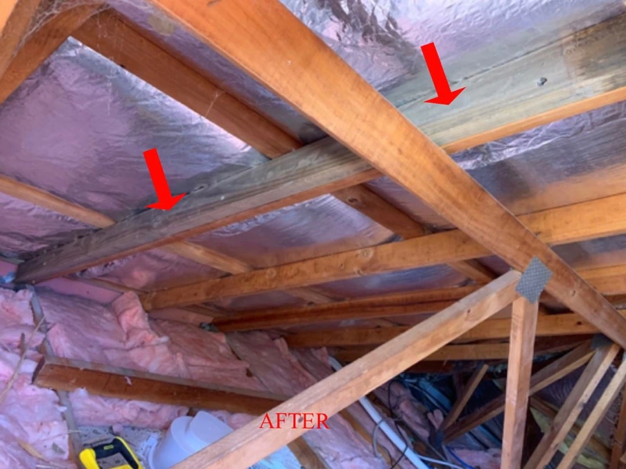 Despite no live termite or timber pest activity being identified, previous termite damage was found to a rafter above the en-suite and a top wall plate above the study sliding door. The owner however is a builder and was able to rectify and reinforce the damaged timbers straight away. Before and after photos are attached below.