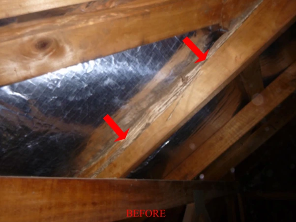 Despite no live termite or timber pest activity being identified, previous termite damage was found to a rafter above the en-suite and a top wall plate above the study sliding door. The owner however is a builder and was able to rectify and reinforce the damaged timbers straight away. Before and after photos are attached below.